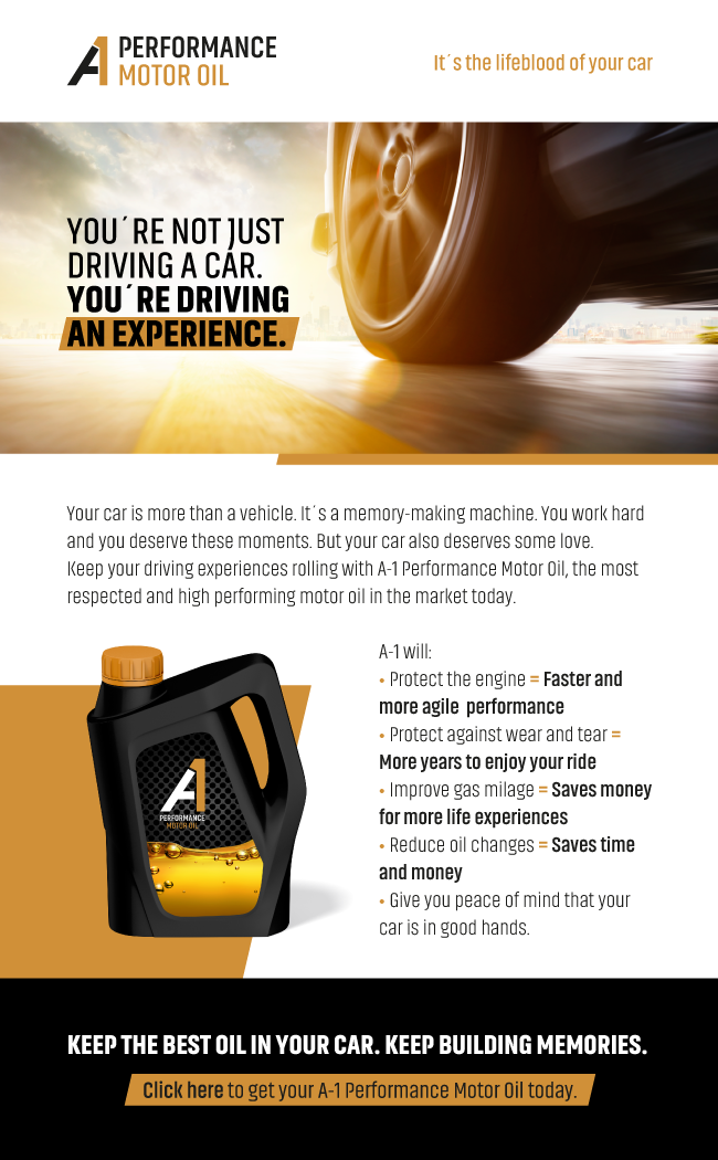 Solution: My designer and I had the goal to make something clean, sleek, and impactful. I wanted the copy to hit on the emotional connection we get with the freedom and experience we get driving a high-performance car while hitting on quantifiable features and benefits.