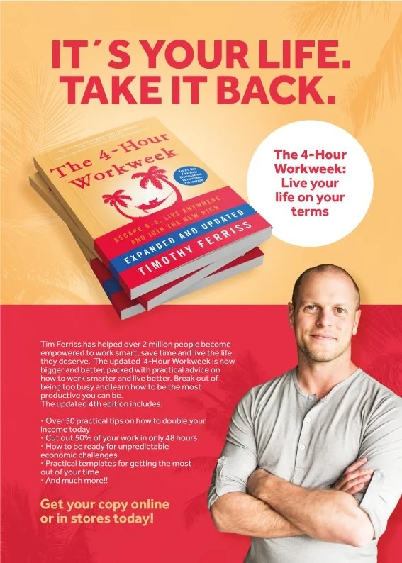 Challenge: Create a one-page magazine spec ad for Tim Ferriss´” The 4-Hour Workweek”. The challenge was to convince well-educated adults from the 24-40 age range to purchase the updated version of the highly successful book. We had to assume that not all people reading the ad had already read the previous book. We would need to emphasize both versions with direct lifestyle benefits.